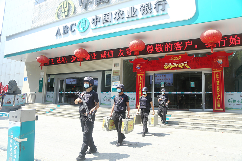 户外温度高达38度,车内温度50度,防护装备还未穿戴,已是满头大汗,九江国有保安集团押运分公司赣G0058S工人先锋号车组一切准备就绪,向第一个网点出发。