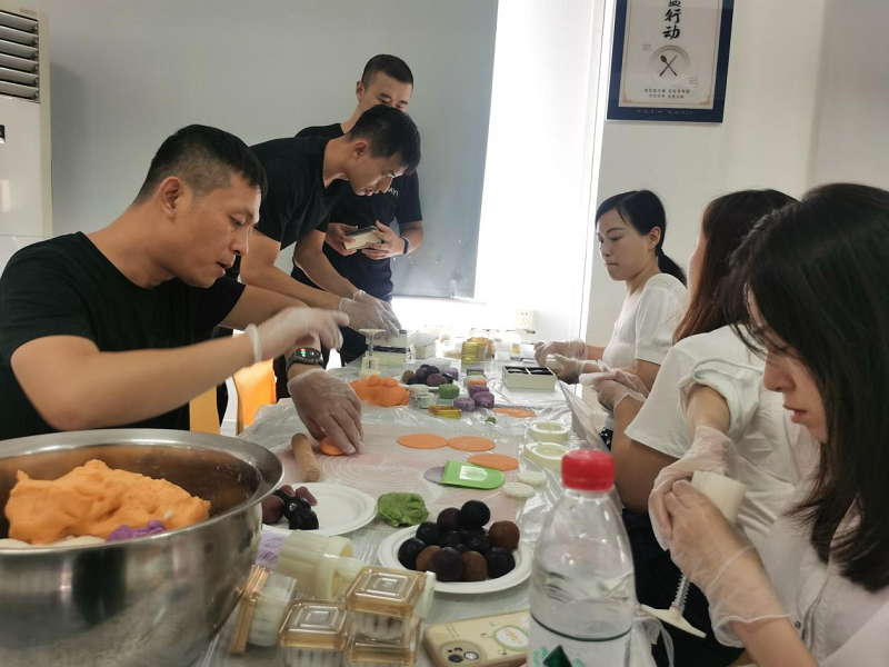 活动现场,桌上一一摆放了制作月饼的熟粉、馅料、手套、模具等材料。几位经验丰富的同事详细讲解手工冰皮月饼的制作过程和制作技巧后,便开始动手制作起来。大家分工明确、配合默契,忙而不乱。当看到一个个漂亮的月饼从自己手中诞生时,大家都异常兴奋和满足。月饼寄托着美好祝福,自己动手制作能注入更多情感因素,让制作出来的月饼更有意义。在活动现场,大家你一言我一语地介绍自己家乡过中秋的习俗,欢声笑语,其乐融融。品尝自己劳动的成果,空气中弥漫着月饼的香甜,欢乐和谐的氛围成为活动最温暖的底色。