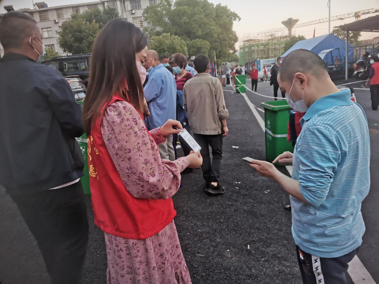 “您好,请出示健康码,我帮您测下体温……”“老人家,你可以走这边的绿色通道……”在现场,志愿者们身穿红马甲,主动亮身份,积极协助采样人员、社区干部对前来检测的市民进行测温登记和信息登记,做好现场后勤保障、解答疑问等工作。他们引导市民按照1米间隔线有序排队,提前准备好号码牌,20人一组,分批排号进行核酸检测。当遇到年老体弱的群众时,他们不仅提供座椅,还优先引导老人进行核酸检测。在市民排队等候时,志愿者们通过播放喇叭等方式,宣传疫情防控的重要性,悉心提醒群众做好个人防护、减少传播风险,确保顺利完成核酸检测工作任务。