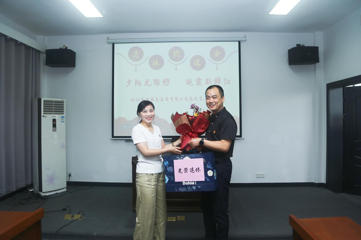 风雨兼程十余载,真情欢送暖人心。6月29日下午,九江国有保安集团有限公司为旗下物资销售分公司副经理刘昕芳同志举办退休职工欢送会。集团党委书记、董事长方东森出席欢送会,总经理熊武强代表集团公司为刘昕芳同志送上退休纪念品,并献上鲜花,向刘昕芳同志为公司所做出的贡献表示感谢。