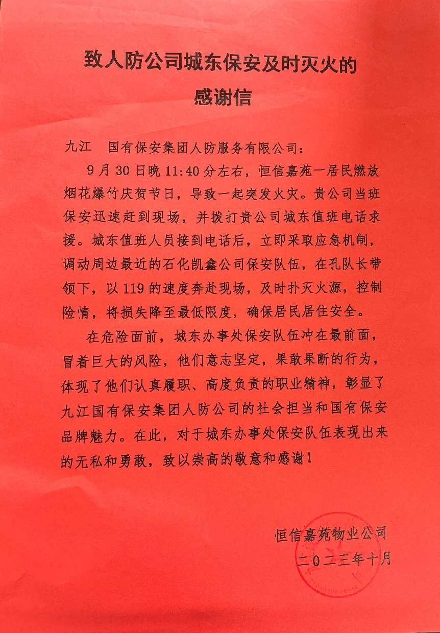 10月8日,一封致人防公司城东保安及时灭火的感谢信,送到了九江国有保安集团人防公司。