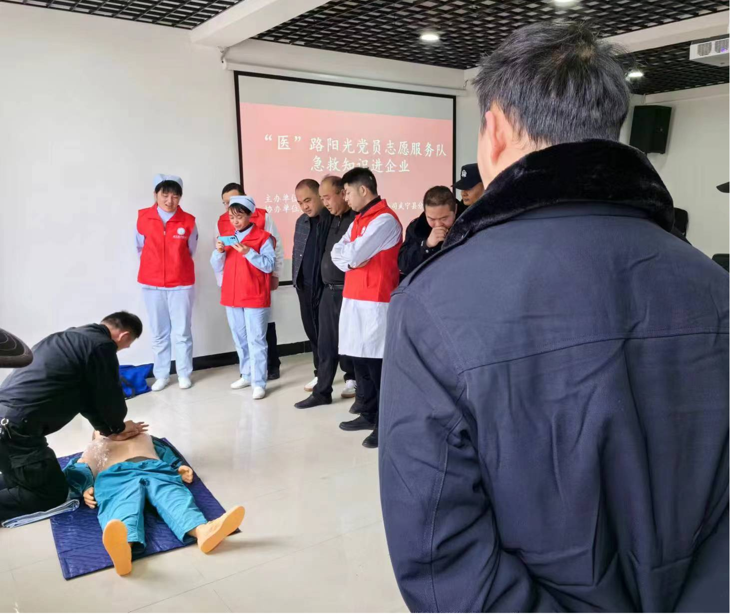 为推进主题教育走深走实,切实提高员工应对意外伤害、突发事件现场处置能力和急救技能,1月10日,武宁县分公司特邀县人民医院“医”路阳光党员志愿服务队走进县分公司,开展以心肺复苏、AED使用和海姆立克急救法急救为内容的健康讲堂,现场教学急救知识。